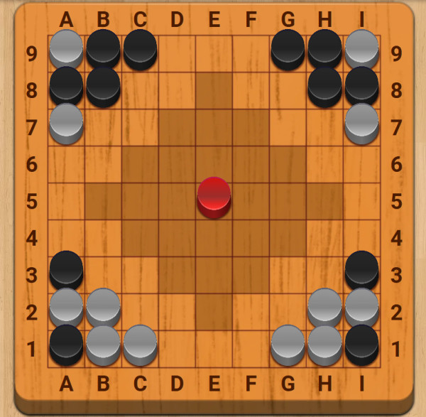 Kameny jsou rozmíchány v základním postavení, přičemž červený kámen zůstává uprostřed: