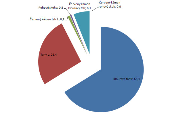 Dále jsme se dozvěděli, že tahy červeným kamenem jsou poměrně často využívané. Přirozeně v celkovém koláči oproti běžným kamenům to vypadá málo (6,1%), ale je třeba si uvědomit, že je tam jen 1 červený kámen a 24 klasických. To znamená, že zatímco na počet tvoří červený kámen proti ostatním 4%, tak je využíván na více než 9%.